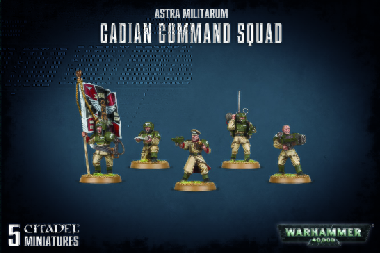 This set allows you to build five Cadian Command Troopers, including a Company Commander, a Medic, a Special Weapon Trooper, a Vox-caster and a Guardsman with Company Banner. The squad can be armed with a choice of weapons including a sniper rifle, a heavy flamer, a plasma gun, a grenade launcher, a flamer, a meltagun, a powerfist, a chainsword, a power sword, a plasma pistol, a bolt pistol and a laspistol. Also included are two different Company Banners, a variety of heads and additional accessories to allow you to customise the squad.