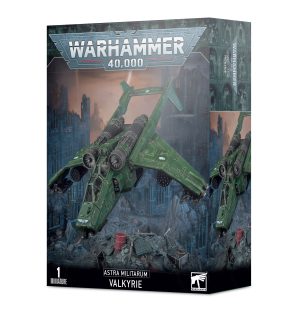 This multipart plastic kit builds one Valkyrie – a twin-engine attack aircraft that can transport troops into battle. It sports a choice of nose-mounted weapon – either a lascannon or multi-laser – as well as a pair of underslung hellstrike missiles or rocket pods, mounted beneath its wings. The Valkyrie features a highly detailed interior, including a pair of optional door-gunners crewing heavy bolters, as well as two pilots with a choice of heads, visible beneath a clear plastic canopy.