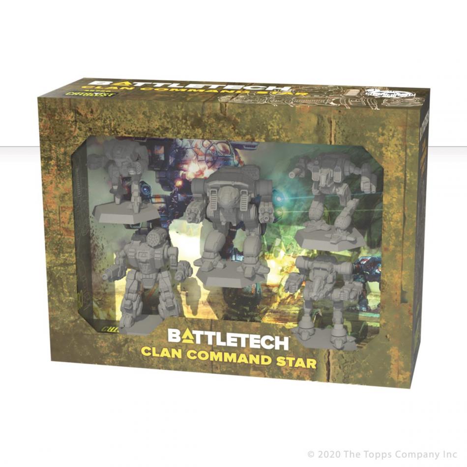 The Clan Command Star includes the Dire Wolf, Summonder, Stormcrow, Mist Lynx, and Shadow Cat—no assembly required—along with five MechWarrior pilot cards and five Alpha Strike cards.