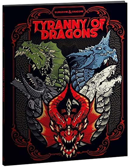 Tyranny of Dragons is a single special volume re-release of the two-part adventure from 2014 featuring a new cover designed by Hydro74. The 224-page adventure combines the two previous titles (Hoard of the Dragon Queen and The Rise of Tiamat) into one book, taking players from level 1 all the way to level 16 as they contend against the Cult of the Dragons plans to bring their queen Tiamat to the Forgotten Realms.
