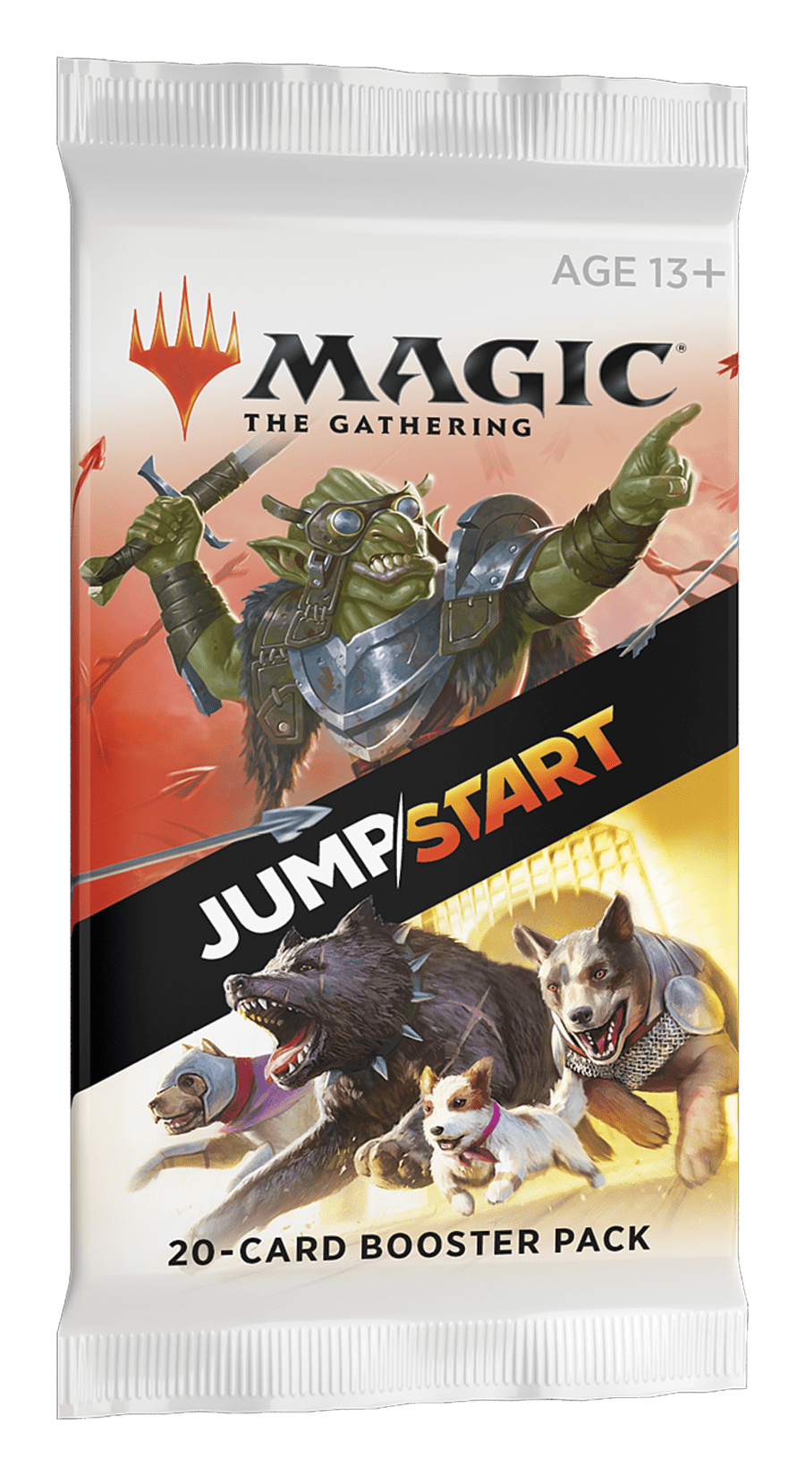 Each Jumpstart booster includes 20 cards. All 20 cards fit a theme, and most themes have multiple variations—enough to make 121 possible 20-card lists inside any given pack. Lands are included, so two packs are all you need to start battling.