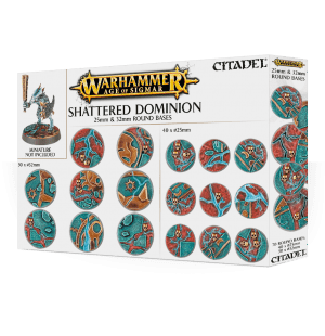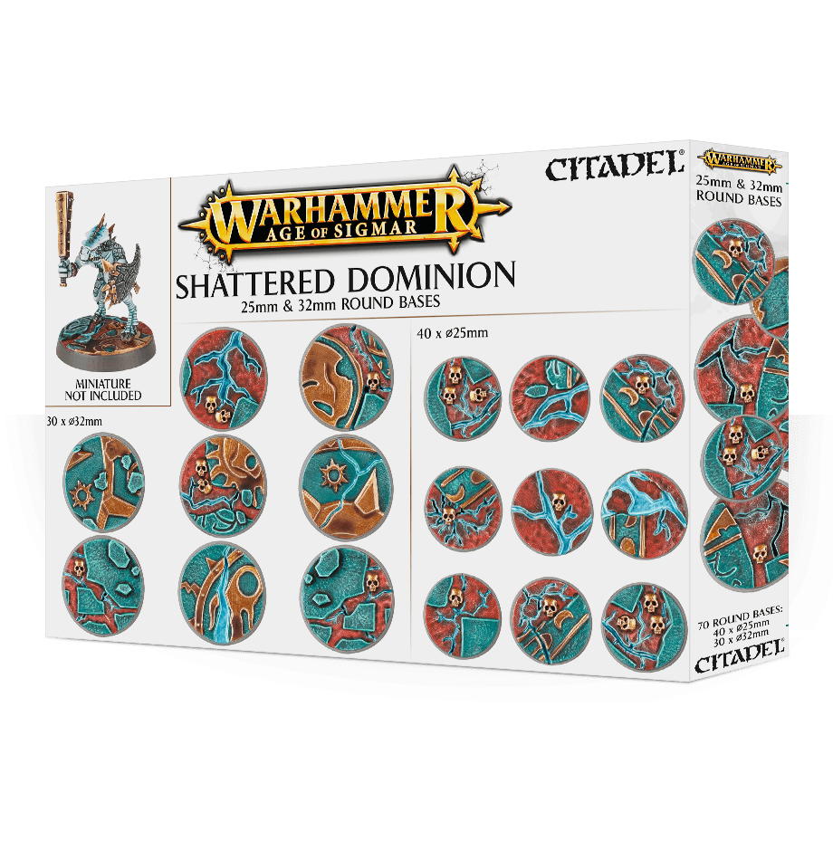 esigned to match and complement the Realm of Battle: Shattered Dominion gameboard, these awesome, highly detailed plastic bases are ideal for the foot-soldiers in your Warhammer Age of Sigmar collection. You’ll receive 40 25mm Round bases and 30 32mm Round bases, with 16 extra skulls for decoration – these moulded bases will help you achieve a stunning look for your miniatures!