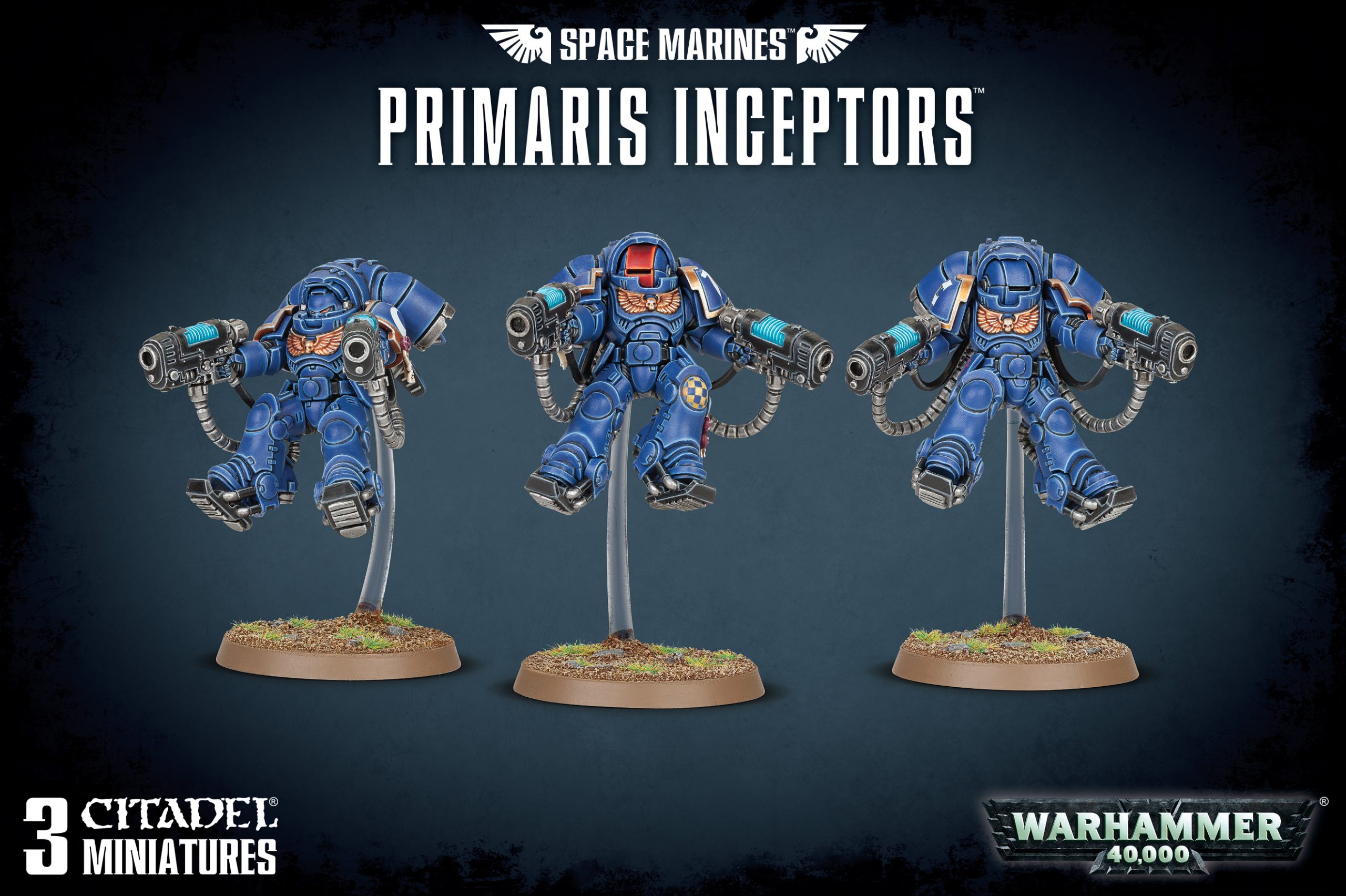This multi-part plastic kit contains the components necessary to assemble a set of 3 Primaris Inceptors. Clad in Mk X power armour featuring a bulky jump pack – thrust-vectoring rocket engines mounted on the Space Marine’s back, enabling fast, bounding leaps to close on the foe at dizzying speed – they present a unique, easily recognisable silhouette. The jump pack itself and the blast shield cowl that protects the Inceptors’ heads from the immense heat of the pack’s rockets dominate the miniature, with posable fins, shock-absorbing devices attached to the boots and extra cabling and vents unique to this kit. The Inceptors can be armed with either 2 plasma exterminators each or 2 assault bolters each – the plasma exterminators are heavily shielded to provide protection against heat discharge and the assault bolters feature distinctive box magazines.