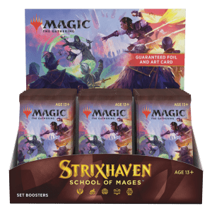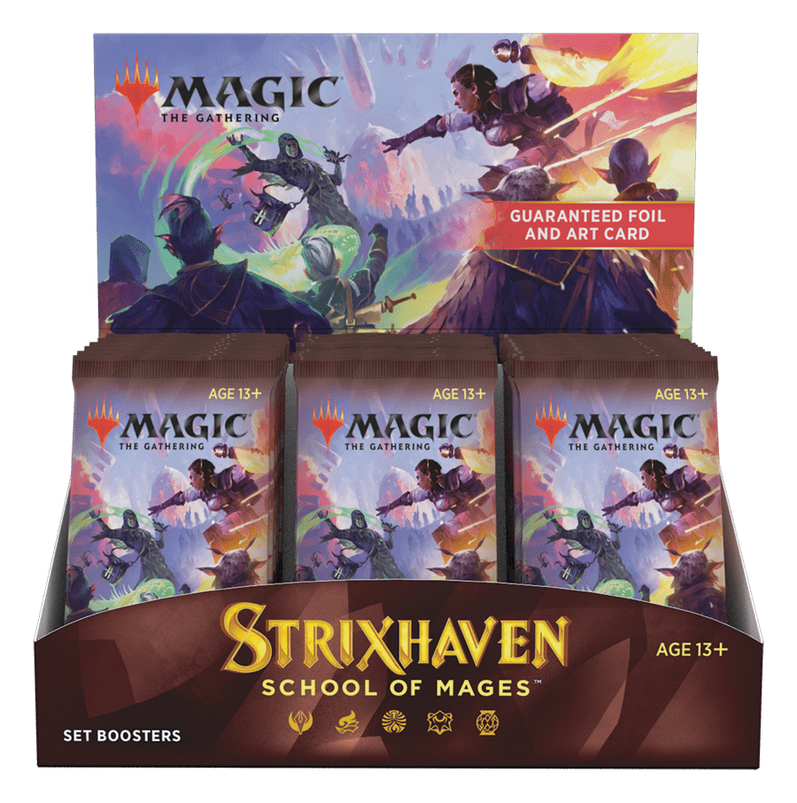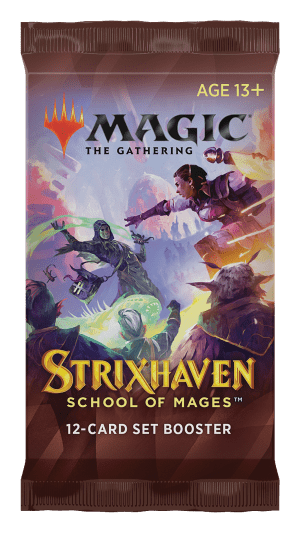 Each pack contains 12 Magic cards, including 1 Mystical Archive card (Uncommon, Rare, or Mythic Rare), 1 Lesson card (Common, Uncommon, Rare, or Mythic Rare), 1 Rare or Mythic Rare, 1 foil of any rarity, 1 Wild Card of any rarity, 6 assorted Commons or Uncommons that are thematically connected (with Commons connected to other Commons and Uncommons connected to other Uncommons), and 1 Land card—plus 1 Art Card and 1 Ad/Token or special card from Magic’s history (a card from “The List”). A foil-stamped Signature Art Card replaces the Art Card in 5 percent of Set Boosters, and a card from The List replaces the Ad/Token in 25 percent of Set Boosters.