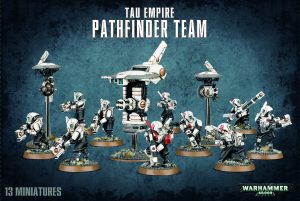This multi-part plastic kit contains 137 components with which to make 10 T’au Pathfinders, a Pulse Accelerator Drone, a Grav-inhibitor Drone and a Recon Drone.